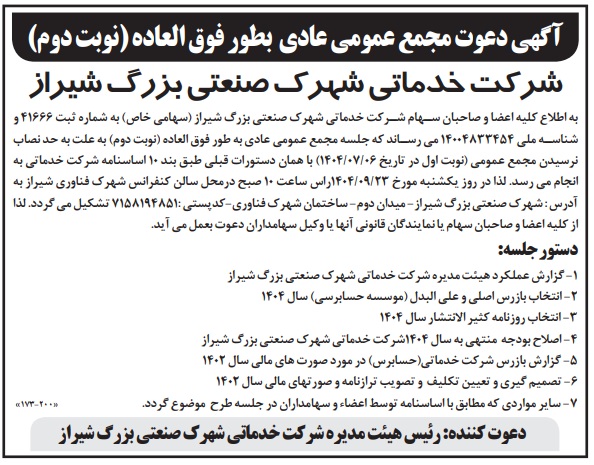 آگهی دعوت مجمع عمومی عادی  بطور فوق العاده (نوبت دوم)شرکت خدماتی شهرک صنعتی بزرگ شیراز